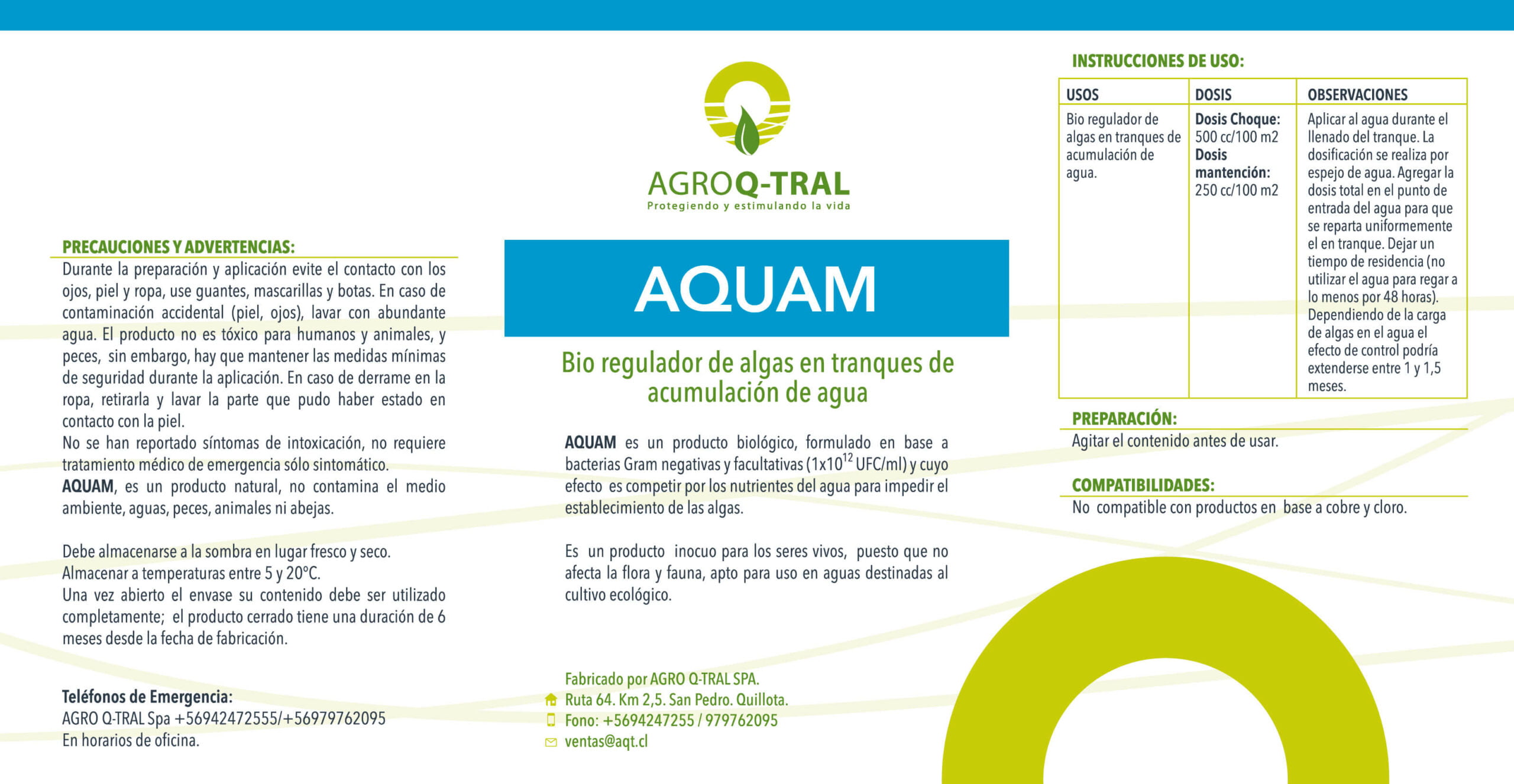 AQUAM, es un producto inocuo para los seres vivos, puesto que no afecta la flora y fauna, apto para uso en aguas destinadas al cultivo convencional y orgánico.